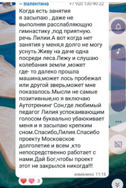 С 2021 года являюсь ведущим педагогом Ноошколы в Проекте “Московское Долголетие” по нескольким авторским программам, среди которых “Дизайн тела и сознания”; “Московское долголетие. Технологии обучения старшего поколения” и ”Правополушарная живопись”.